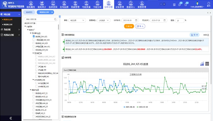 分析诊断功能由对比分析、负荷分析、经济运行分析3项子功能组成。对比分析,提供统一设备或同一类型设备在不同时段的对比工具,计算查询时段的特征值,帮助用户对配电回路的用电情况进行分析。